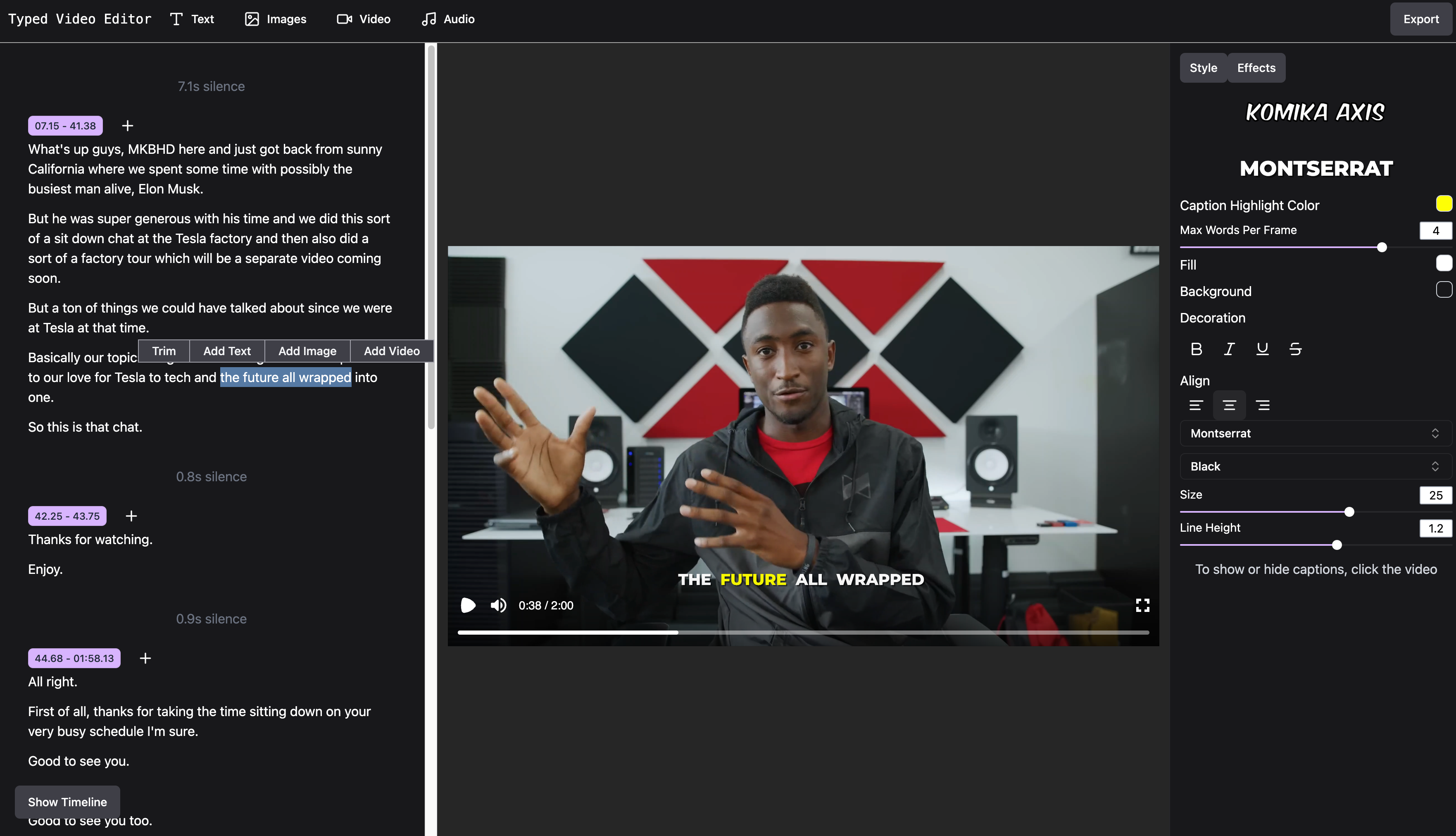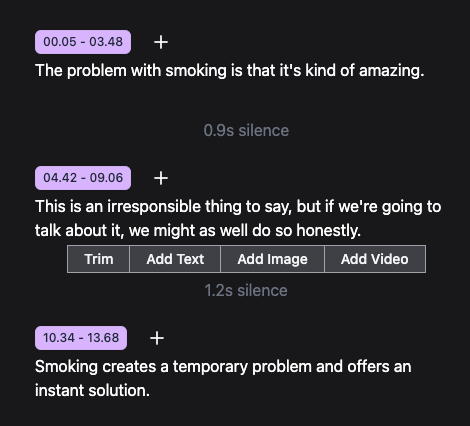 Cut, trim, add image overlays and b-rolls by selecting text. Silences greater than 0.8s are highlighted so you can edit them easily.